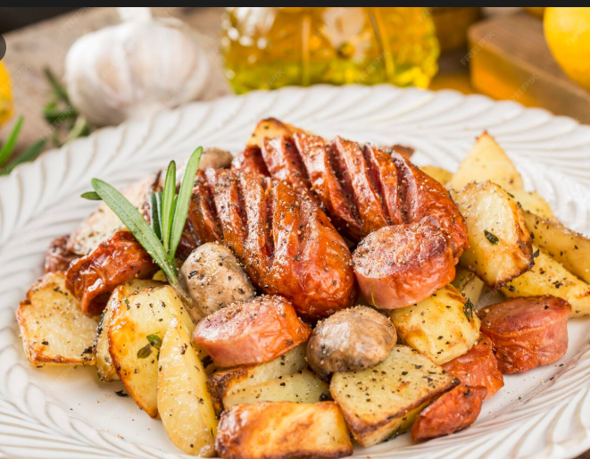 Geroosterde aardappelen, BBQ spek, gegrilde ui, BBQ saus, peterselie