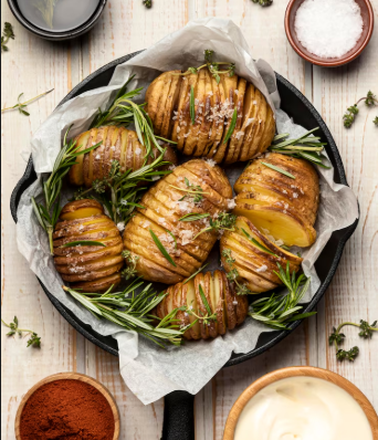 Geroosterde aardappelen, pittige peper, cheddar saus, maïs, krokante ui, peterselie