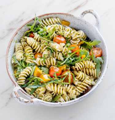 Vegetarische kip, pesto, basilicum, paprika, cherrytomaten, kookroom, pijnboompitten. Inclusief sambal, Parmezaanse kaas en bestek